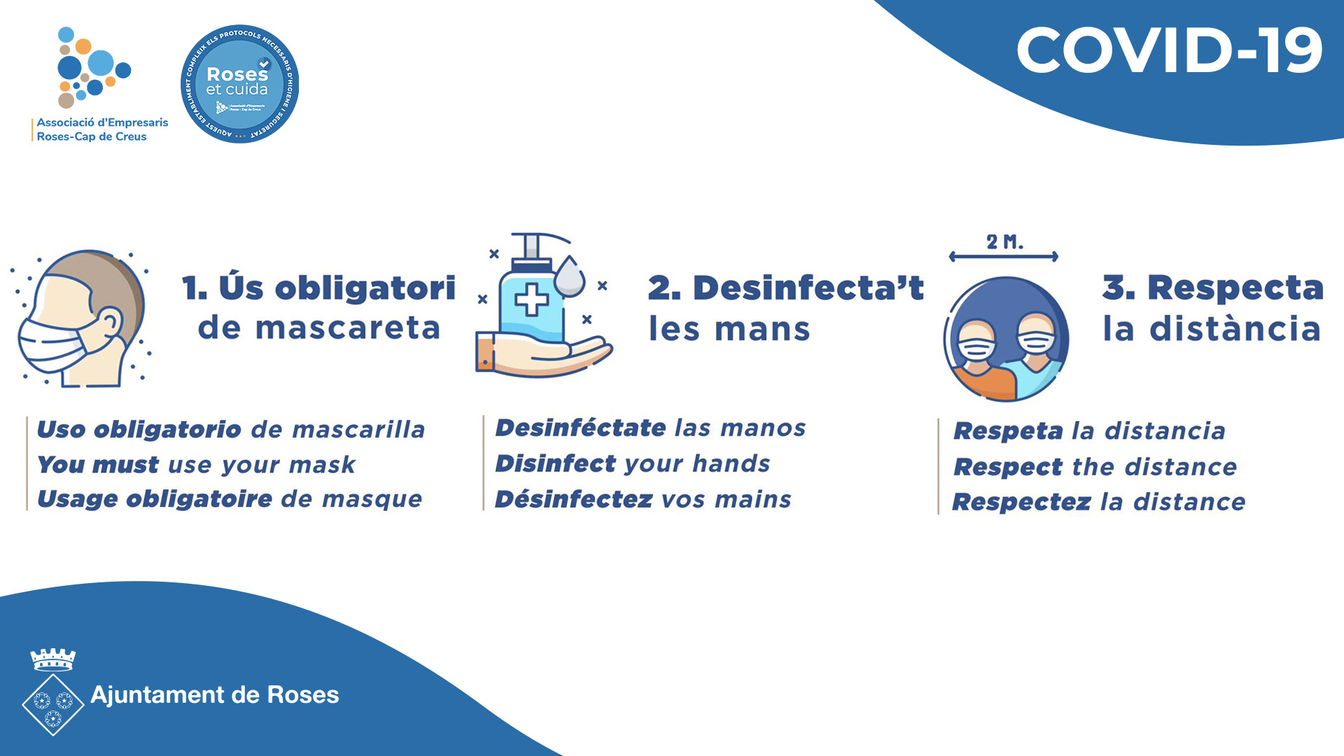 Amb un missatge clar i concís, basat en els tres eixos de prevenció principals marcats per les autoritats sanitàries: ús de mascareta, desinfecció de mans i respecte de les distàncies interpersonals de seguretat, l’Àrea de Turisme de Roses i l’Associació d’Empresaris inicien una campanya que difondran a partir d’aquesta setmana pels seus canals de comunicació. El material emprat (i que també han posat a disposició d’hotels, restaurants, càmpings i resta d’establiments comercials i de serveis que reben públic), es composa d’un petit vídeo i un fulletó informatiu que recullen els consells de prevenció a seguir, editats en 4 idiomes (català, castellà, francès i anglès).