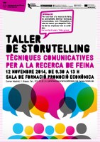 El següent dimecres, 12 de novembre (de 9.30 a 13 h), tindrà lloc el “Taller de Storytelling”, que dirigirà la seva atenció al domini de tècniques comunicatives com l'anomenat storytelling o relat de marca, basat en transmetre un missatge a través d'una història. Concretament, la formació s'adreçarà a l'ús d'aquestes eines per a la recerca de feina o per despertar l’interès de les empreses vers els candidats o projectes empresarials. El taller està adreçat a persones en recerca de feina però resulta també útil per a emprenedors i empresaris.