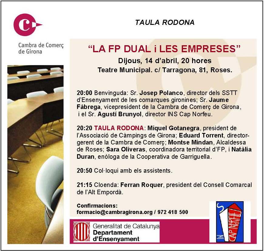 Per donar a conèixer aquest projecte, es convoca els empresaris a la taula-rodona que tindrà lloc dijous al Teatre de Roses. L'acte comptarà amb la participació del director territorial d'ensenyament a Girona, Josep Polanco; del vicepresident de la Cambra de Comerç de Girona, Jaume Fàbrega, i del director de l'INS Cap Norfeu, Agustí Brunyol.