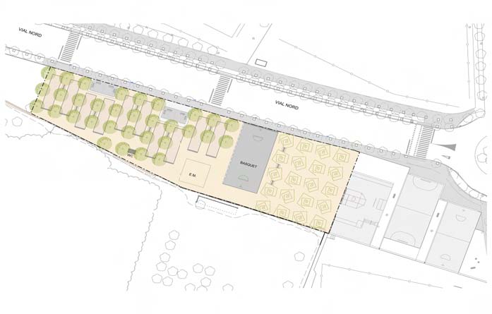 Per la seva banda, la nova pista de bàsquet projectada tindrà una superfície de 16,5 x 27,5 metres, pavimentada amb formigó. La creació d’aquesta pista permetrà que l’existent fins ara, més propera als habitatges, sigui reconvertida en una pista de patinatge, evitant-se així les possibles molèsties que l’impacte de les pilotes a les cistelles podien produir als veïns.