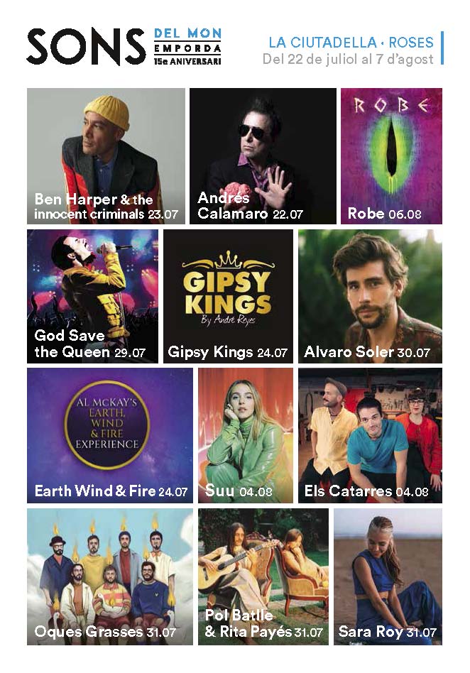 Fa quinze anys Sons del Món va començar com un petit esdeveniment que posava en valor l’espai patrimonial empordanès, el producte enològic i la gastronomia local a través de la música. En aquesta quinzena edició, el Sons del Món presenta una proposta desacomplexada de primer nivell que fa que la Ciutadella de Roses, un espai patrimonial de primer ordre, esdevingui un dels grans espais escènics del país. Sons del Món es reivindica com una de les grans cites musicals de la Costa Brava i, per descomptat, de l’Empordà.