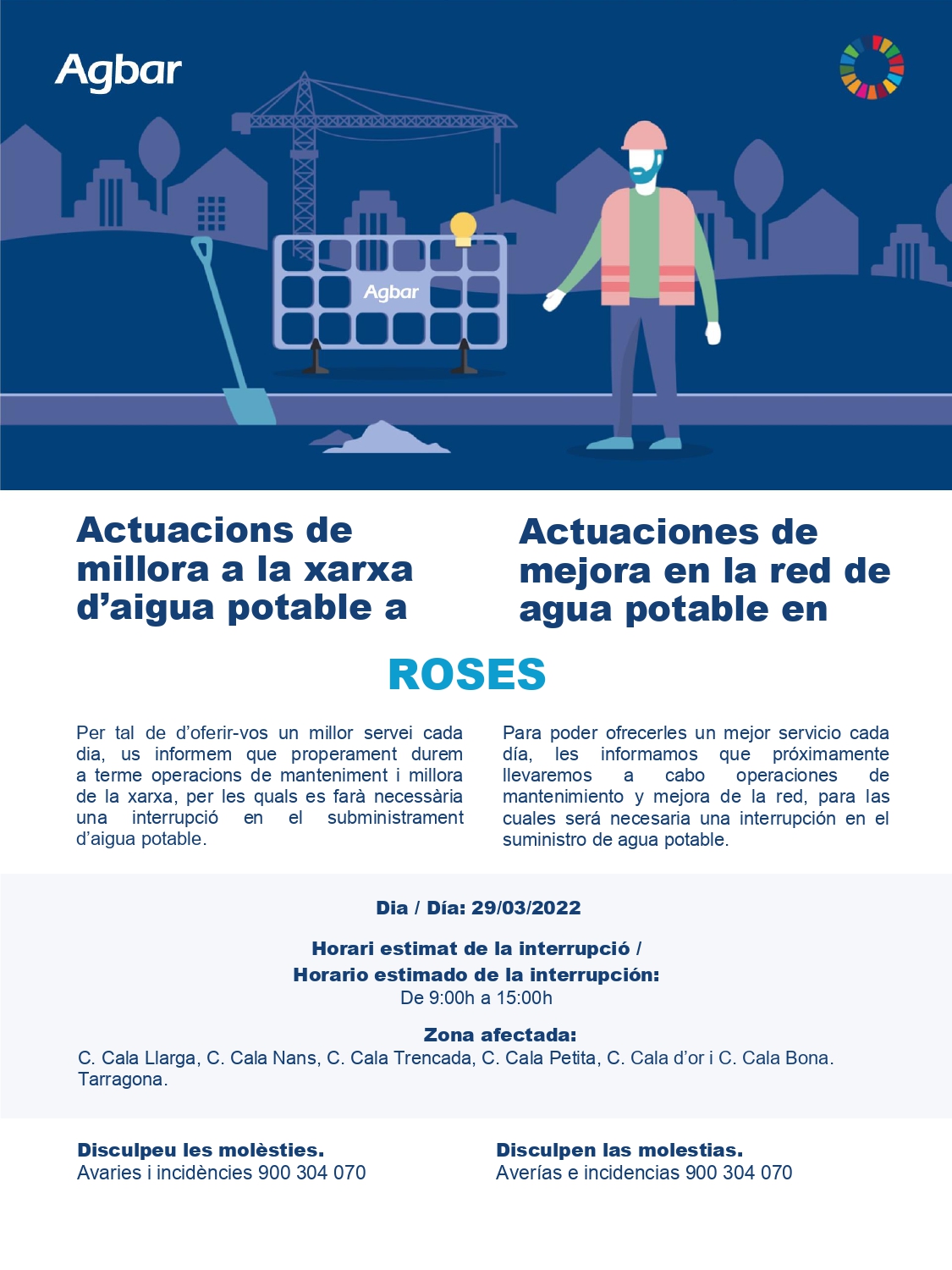 Agbar informa que amb motiu dels treballs de millora de la xarxa de distribució d'aigua al carrer Cala Llarga, demà, dimarts 29 de març, es procedirà al tall de subministrament en diferents carrers de la Urbanització de Santa Margarida, aproximadament entre les 10 i les 15 h. Els carrers afectats són: Cala Llarga, Cala Nans, Cala Trencada, Cala Petita, Cala D'Or i Cala bona.