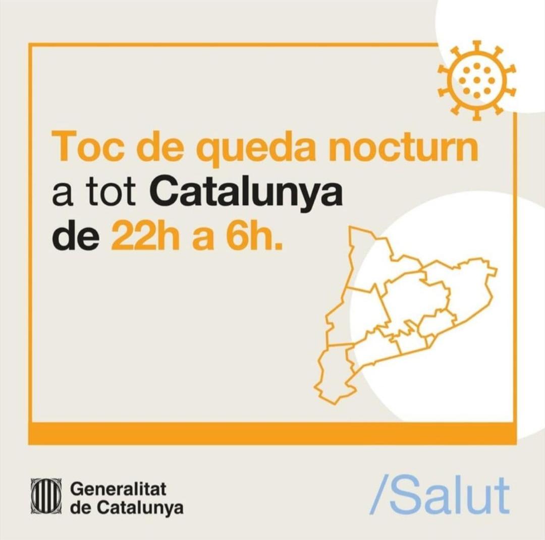 Després de l'estat d'alarma aprovat avui, diumenge 25 d'octubre, pel Consell de Ministres, el Govern de la Generalitat de Catalunya ha acordat activar un toc de queda nocturn que entrarà en vigor aquesta mateixa nit. El toc de queda suposa una restricció de la mobilitat nocturna entre les 22 h i les 6 hores, mentre que els establiments oberts al públic hauran de tancar una hora abans, és a dir, a les 21 h.