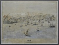 El dibuix presenta una vista panoràmica de Roses presa aproximadament des de la platja de Santa Margarida, en la qual s'emfatitza el caràcter comercial i marítim de la població. La presència de nombroses embarcacions -no només de pesca, sinó sobretot mercants- domina l'escena, on l'autor remarca també l'origen de les naus amb les banderes que les presidien: espanyoles, franceses, italianes o angleses.