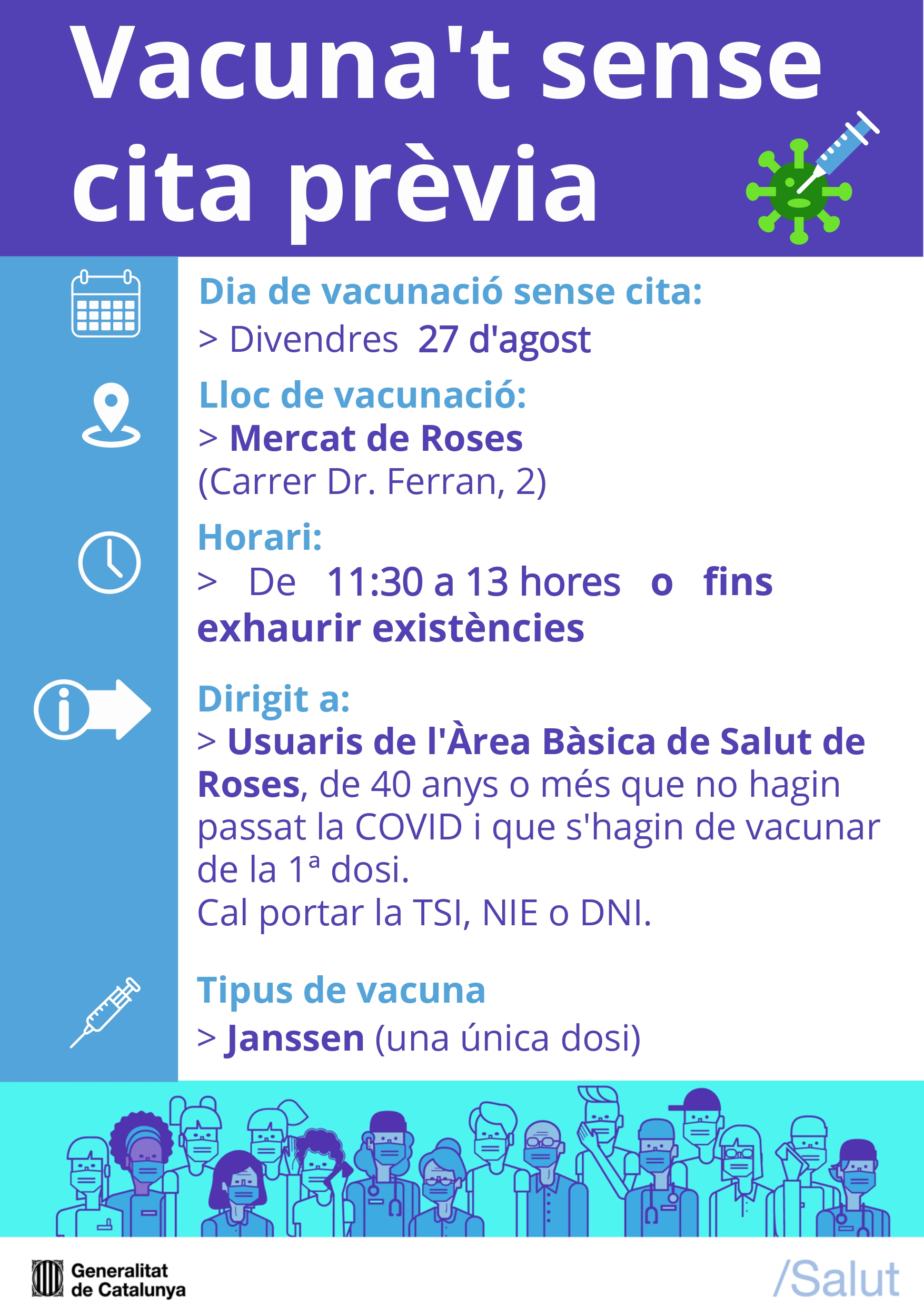 La jornada tindrà lloc al centre de vacunació covid de Roses instal·lat al Mercat Municipal, entre les 11.30 i les 13 h o fins exhaurir existències. La vacuna que s'administrarà serà la dels laboratoris Janssen (una única dosi)