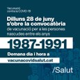 Dilluns 28 de juny començarà la convocatòria de vacunació per a les persones d’entre 30 i 34 anys. Les persones nascudes entre els anys 1987 i el 1991 podran demanar dia i hora per vacunar-se a partir de dilluns a través de ...