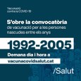 A partir d'avui s'ha obert la campanya de vacunació per a les persones d'entre 16 i 29 anys. Totes les persones nascudes entre 1992 i 2005 poden ja demanar cita per vacunar-se a vacunacovidsalut.cat