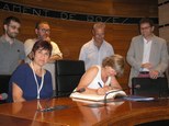 La consellera Meritxell Borràs, acompanyada del delegat del Govern a Girona, Eudald Casadesús; el secretari d’Habitatge i Millora Urbana, Carles Sala i del director dels Serveis Territorials del Departament de Governació a ...